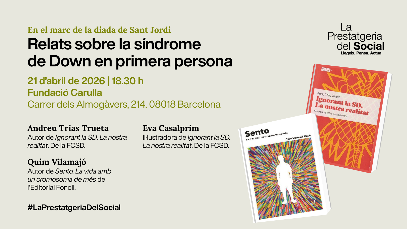 El pròxim dimarts 21 d’abril, conversarem sobre la importància que les persones amb síndrome de Down disposin d’espais d’expressió literària i artística, per poder parlar en primera persona de les seves experiències. Comptarem amb Quim Vilamajó, autor del llibre Sento. La vida amb un cromosoma més (Fonoll); Andreu Trias Trueta, autor del llibre Ignorant la SD: la nostra realitat (FCSD) i Eva Casalprim, il·lustradora del llibre. L’acte es durà a terme a la sala polivalent de la Fundació Carulla, al Poblenou de Barcelona, en el marc de la diada de Sant Jordi. Acompanyeu-nos!
